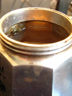 3. เติมฐานด้วยน้ำ ร้อน! หนาว! กรอง! ฉันได้อ่านว่าน้ำชนิดต่าง ๆ เปลี่ยนรสชาติของกาแฟ Moka ที่ชงแล้วของคุณ แต่ถ้าคุณเป็นคนทำอาหารแท้ฉันไม่คิดว่าคุณจะสังเกตเห็นความแตกต่าง คนอิตาเลียนมักใช้น้ำประปาโดยไม่ต้องให้ความสนใจกับอุณหภูมิมากนัก สำหรับน้ำเท่าไหร่นั้นจะมีเส้นเติมอยู่ภายในฐาน (ประมาณแม้จะมีวาล์วลดแรงดัน – สิ่งที่ดูเหมือนน็อตและสลักเกลียวเล็ก ๆ ยื่นออกมาด้านข้าง)